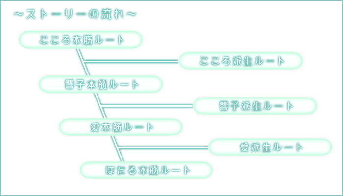 本作のシナリオは下記の構成となっているので、前から順番にプレイしていくのを推奨します(本筋→派生を繰り返していく)。