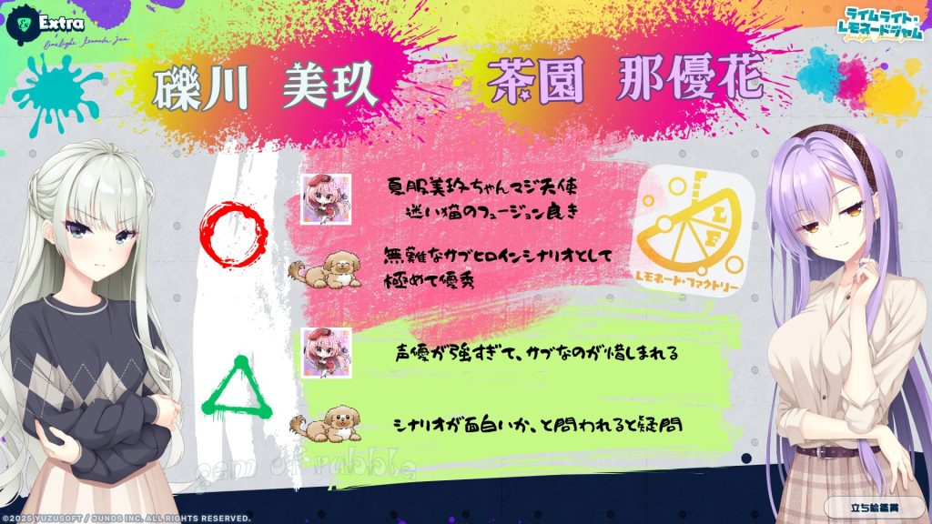 『ライムライト・レモネードジャム』は私の最推しブランドであるゆずソフトさんの作品なので、えりんぎさんはもちろん、みなさんと一緒に楽しくお話しできて嬉しかったです。幸せな時間でした。