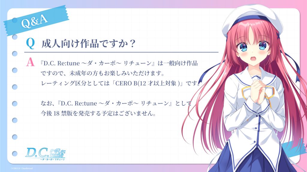 まあ『D.C. Re:tune ~ダ・カーポ~ リチューン』はブシロードが噛んでいるので、「R-18は大人の事情で本当に出せない可能性が高い」と推察している方もいるようですが。