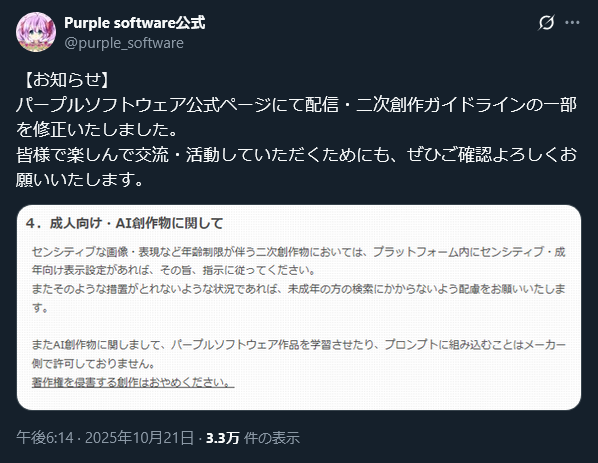 Purple software、配信・二次創作ガイドラインの一部を修正 AI学習を許可しない方針を明示