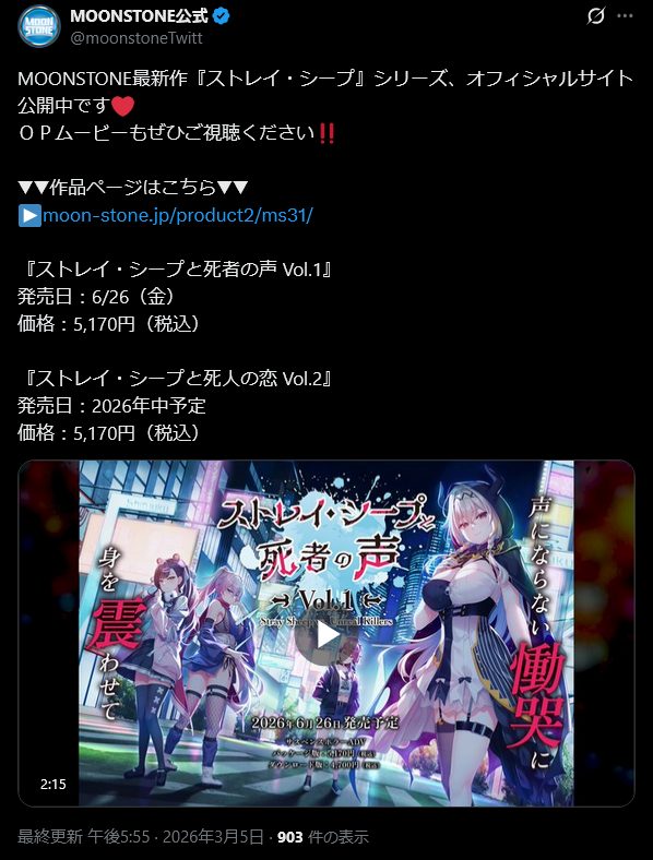 MOONSTONE、最新作『ストレイ・シープ』シリーズ公式サイト公開 『ストレイ・シープと死者の声 Vol.1』2026年6月26日発売予定